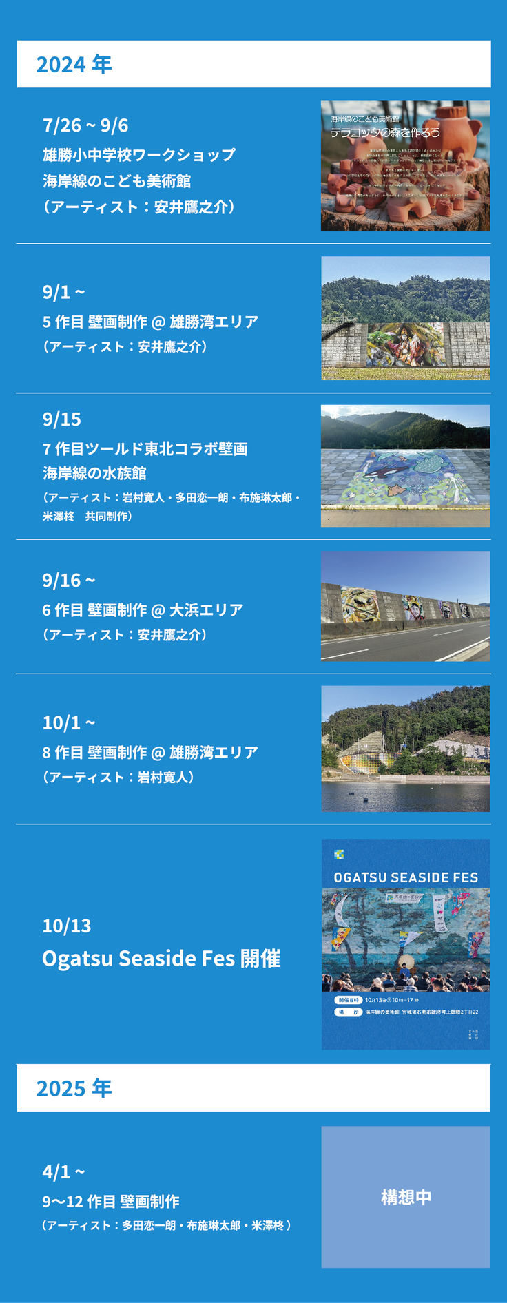 また、毎年の制作の開始には壁画を洗い、下地を一緒に塗るイベント「壁画びらき」、完成後はみんなで祝うお祭り「OGASTU SEASIDE FES」を開催し、壁画作品に愛着を持ち雄勝に根付いていくためのプロセスをつくっています。