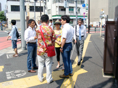 諏訪町交差点での撮影~暑い中、自転車やトラックが行き交うリスキーな撮影でしたが、無事終了。エキストラの方々には、無神経な役を演じていただきました。実際は親切で、よく気が付くナイスガイたちです。