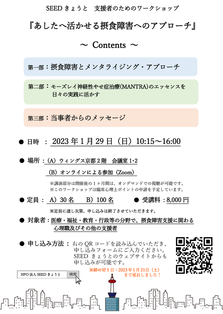 SEEDきょうとでは、今回のクラウドファンディングのリターンの一つとなっております、支援者のためのワークショップ「あしたへ活かせる摂食障害へのアプローチ」を1月29日(日)に開催します。現在多くお申込みをいただいているため、申し込み締め切りを1月21日(土)まで延長いたしました。
