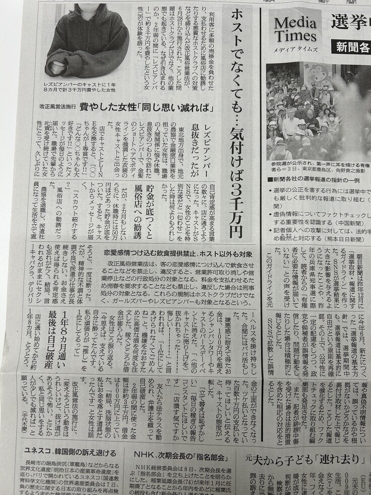 改正風営法でホストのみならず、同じような洗脳商法で高額な支払いをさせ、風俗を斡旋している違法な飲食店を追放する活動の一役を担えればと被害女性と共に取材に応じてきました。