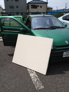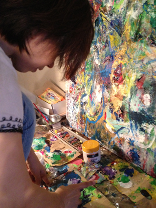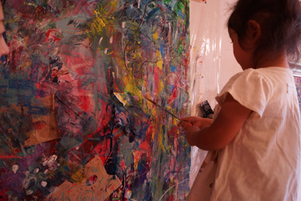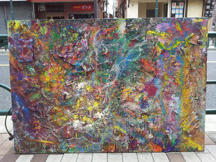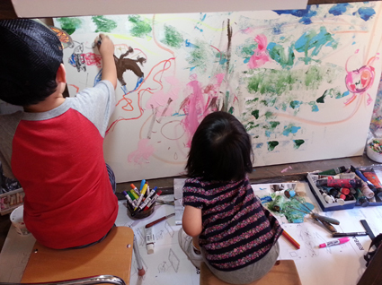 これ、2年前の作品展の際、有志で展示をお手伝いいただいた皆さんから出たアイデアでした。来場された方に、出展している作家と同じキャンバス、画材で自由に描いてもらったらどうか、と。そこで、当時、たまたま我が家に、まだ描いていない真っ白な50号のキャンバスがあったので、会期中のギャラリーに置いてみました。すると、子どもたちはもちろん、おとなたちも、最初はためらうものの、ひとたび筆や指で描き始めると、まるでずっと前から同じように描いていたかのごとく、楽しそうに腕を動かし続けていました。
