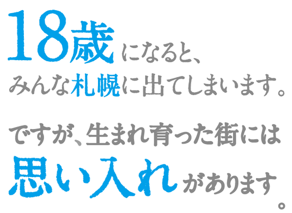 僕らの住む街、北海道滝川市は人口約42,000人の小さな市で、札幌と旭川の中間に位置しています。18歳、高校卒業時には進学や就職で、多くの人が札幌や東京へ引っ越します。なんで、みんな滝川からいなくなってしまうんだろう?行きたい学校も、働きたい場所もないのかもしれません。僕も一度は札幌に出ていたし気持ちはわかります。でも生まれてきた場所の思い出は、誰にだって絶対特別なんです。