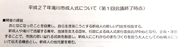 滝川市の成人式開催の趣旨には、こんな1文があります。『市民の思いあふれる式典を創造し、新成人にこれからのまちづくりを担う大人としての心構えについて伝える機会とし、新成人の地元愛を育む / 開催の趣旨(抜粋)』