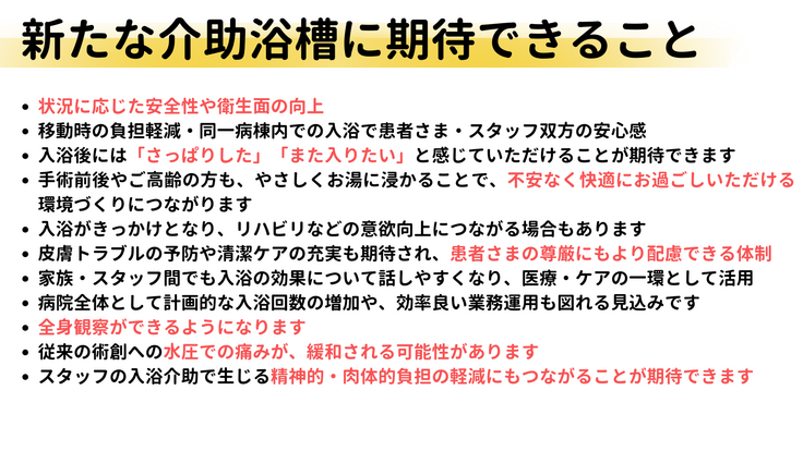 現状のシャワー浴槽を浸かることのできる介助浴槽に更新することによって安心した入院生活を送る体制構築ができ、より円滑な医療提供が可能になると考えています。