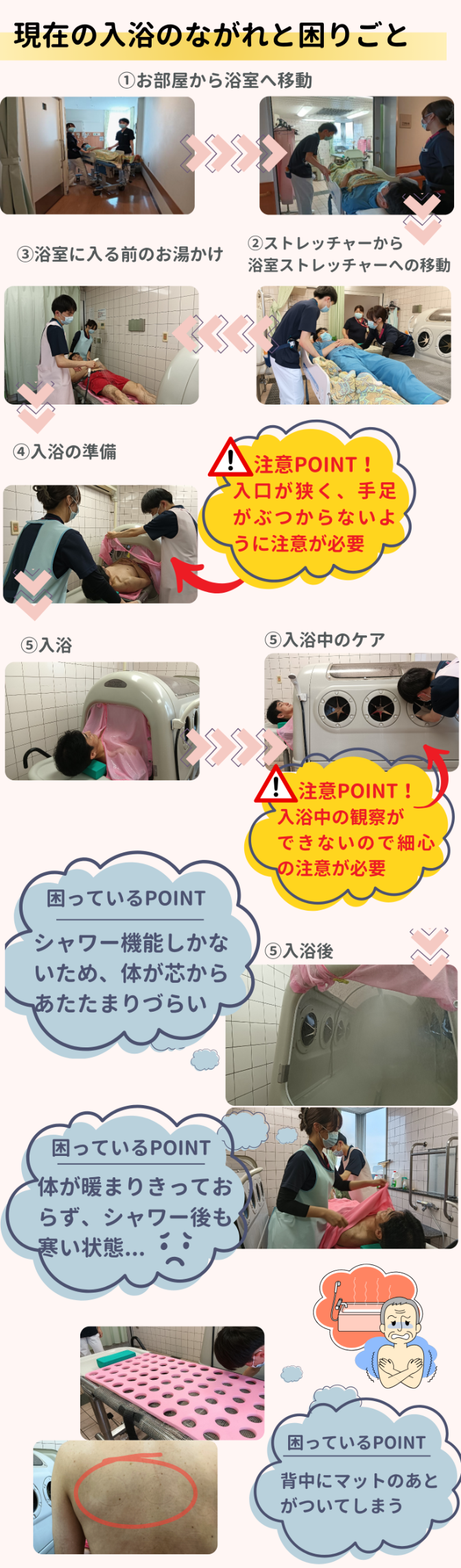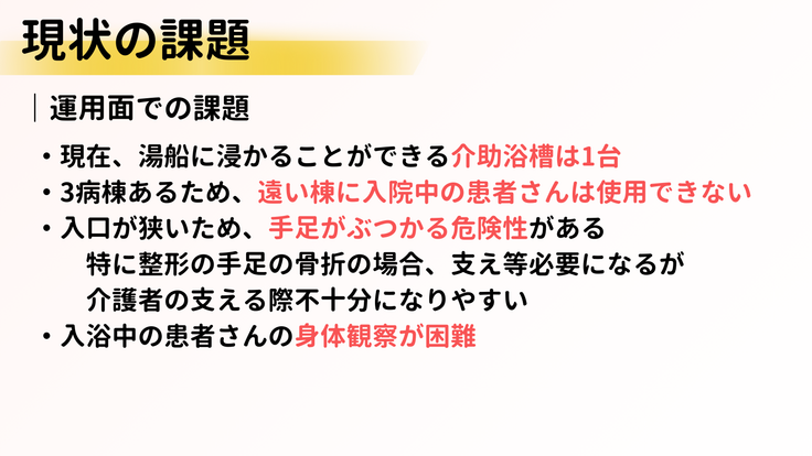 そこで、私たちは、安心して快適な入院生活を送ってもらうために欠かせない「入浴」に着目しました。現状、当院には介助浴槽が1台しかなく、多くの患者さんが思うように入浴できず、手術後の回復期を楽しく、リラックスして過ごすことが難しいという声も届いています。