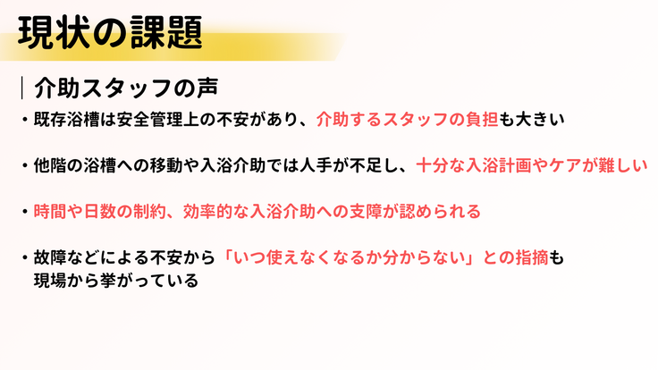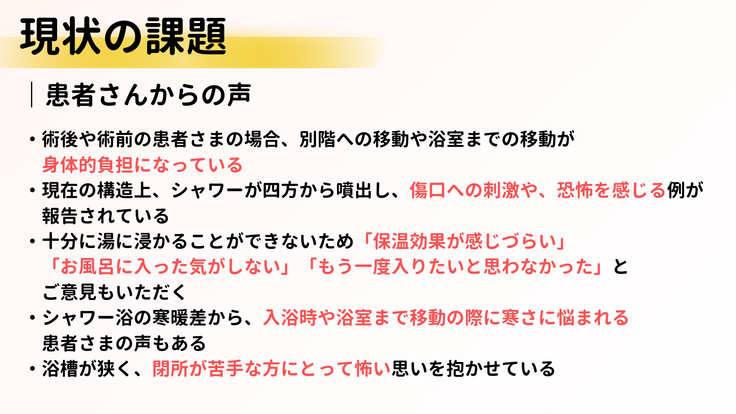 一方で医療の担い手も限られる中で、患者さま・ご家族から「入院中のお風呂が大変だった」「シャワーしか使えず、体も心も休まらなかった」という声があがっています。現場で働くスタッフも、移動や介助の負担、老朽化した設備の不便さに頭を悩ませてきました。「なんとかしたい」という現場からの切実な声が、このプロジェクトの出発点です。