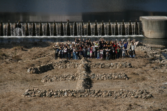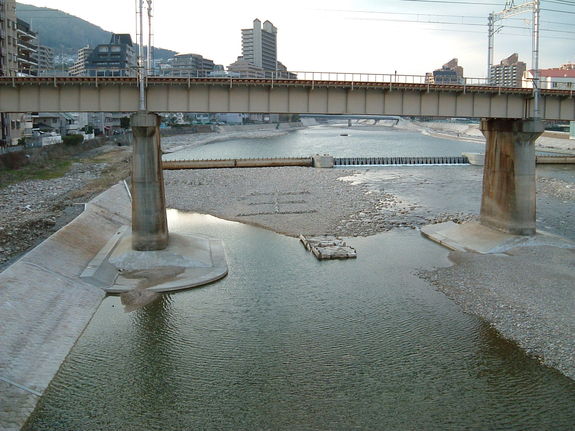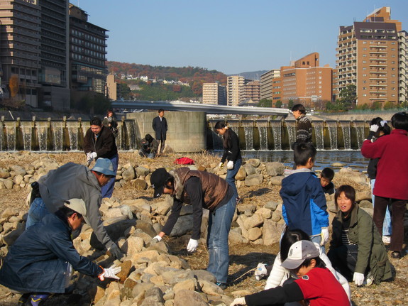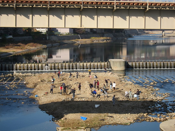 「生」は2005年1月、阪神淡路大震災から10年目、街と人の再生を願い震災追悼モニュメントとして、美術家大野良平が宝塚市武庫川の中州に河原の石を積んで制作しました。