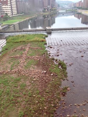 「生」のモニュメントは自然とともに生きています。だから雨が降ると崩れていきます。これは前々回の雨のあと。先日の、警報が出た時は水没しました。今はもう少し崩れて、どうしても手直しが必要な状態です。今回の「生」は4代目です。よくもちました。またみんなで積み直しです。こうして「人と自然の共存」によって「生」は生かされています。みなさんのご支援によってこの「生」のライトアップは続けていくことができます。どうぞよろしくお願いいたします。