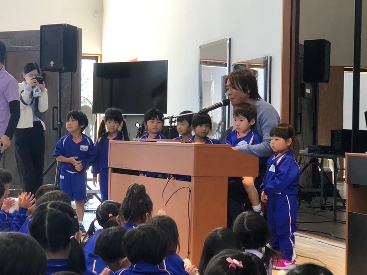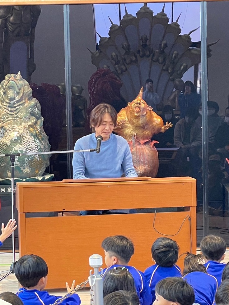 作曲家の仕事について解説し、子どもたちの名前や好きな食べ物などから即興で曲を作ってみせると、子ども達らは笑顔を見せました。最後はマシコタツロウさんの作曲「ハナミズキ」で締めくくりました。