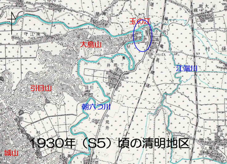 まだ清明地区が出来ていない1930年頃地区は山と川と田んぼに囲われていました。南から上荒井・下荒井・江端とかの名前がついているように水に深くかかわり、江端川と朝六つ川が地区を縦断していました。北の端は玉江と言って雨が続くと大きな湖みたいになってしまいました。そこに突き出た小山が島のように見えて大島と呼ばれたそうです。(今は大島山は削られ住宅地です)