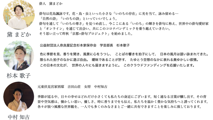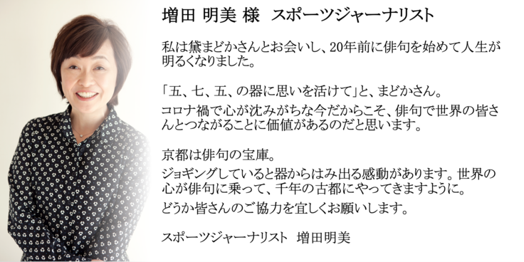 黛まどか 俳人。神奈川県生まれ。 2002年、句集『京都の恋』で山本健吉文学賞受賞。オペラの台本執筆、校歌の作詞、テレビでのナレーションなど、幅広い分野で活躍。北里大学客員教授、京都橘大学客員教授、昭和大学客員教授、ワコールホールディングス社外取締役。著書に『奇跡の四国遍路』『引き算の美学』他多数。 2010~2011年、文化庁「文化交流使」としてパリを拠点に欧州で活動。 2020年「京都×俳句プロジェクト」の呼びかけ人として世界の文化交流プロジェクトスタート。 クラウドファンティングは支援しか経験がなく、自分で主宰をするのは初めてです。 このプロジェクトを通して、「いのち」の尊さを俳句を詠むことで見つめ直し、 その輝きを詠み留め世界中の俳句愛好家と共にオンライン句会で出会い、 共にこのコロナパンデミックを乗り越えていきたいと思います。