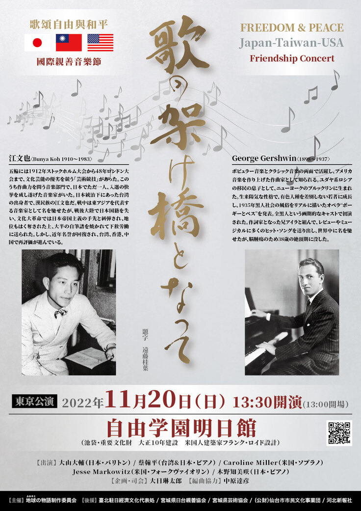 2019年から私たちが日本と台湾の各地、そしてニューヨークで行ってきた国際親善コンサート「歌の架け橋となって」は、音楽をもって国と国、人と人とをつなぎ、我らが平和と自由を希求していることを世界に訴えようというものです。これを近い将来、国連のステージ上で東アジアの国々から音楽家たちを集めて開催できないものかと考えています。