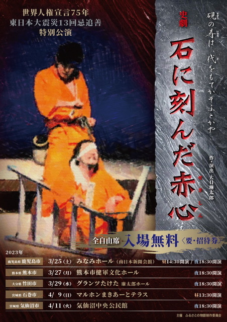 鹿児島市、熊本市、大分県竹田市、宮城県石巻市、気仙沼市において、「史劇 石に刻んだ赤心」の巡業公演を入場無料で行います。させに、東京公演、仙台公演は有料にて開催されます。 募集開始日は3月中旬→3/13~22東京にてリハーサル→3/25~30まで九州三都市〈鹿児島・熊本・大分竹田〉の巡業公演→4/6東京公演→4/8~11石巻・気仙沼巡業公演→4/13&14仙台公演。プロジェクト実施完了日は4月14日(金) 募集終了日は5月8日(月)。→5/9~石製品の製作開始→製品がそろい次第発送。 ここで集められた資金は、五か所の無料公演の費用のうち、劇場費・稽古場37万円、移動費・宿泊費122万円、印刷費(チラシとパンフレット)30万、記録映像撮影編集費15万円などに充当します。
