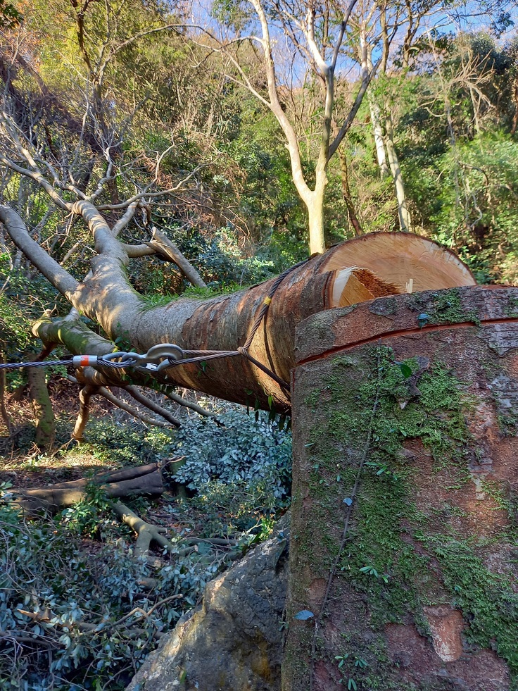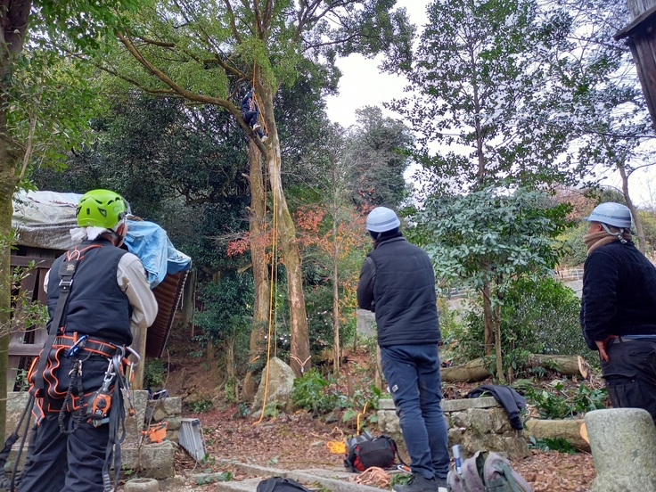 そのため、今回の作業は重機を使用せず木をロープで縛り、