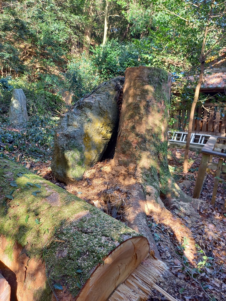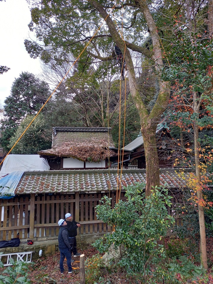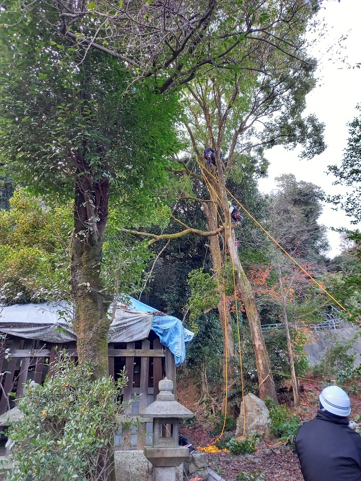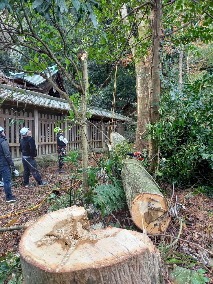 先日、修復開始までの準備作業として本殿周りの樹木伐採が行われました。