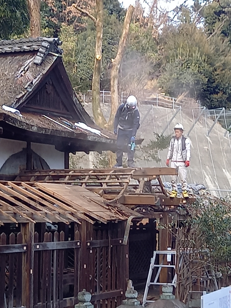 数日間で、正面回廊屋根の解体が終了し唐門が取り外されました。