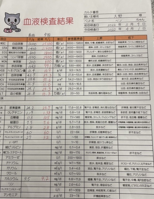 マリアは外注に血液検査を出さないといけないので1週間くらいで結果がでますので結果が出ましたらご報告させて頂きます