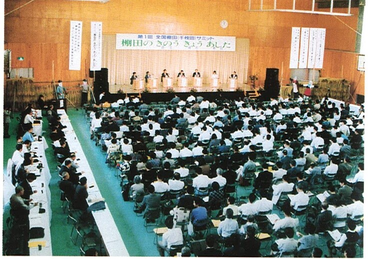 千枚田オーナー制度で交流人口が増えにぎわいを見せる梼原町の様子は、全国規模で知られるようになり、たくさんのメディア取材も入るようになるほど注目されました。1995(平成7)年11月には第1回となる「全国棚田(千枚田)サミット」を開催。棚田の維持や地域学習の場、交流人口の受け入れの場として情報交換を行う機会を設けました。このサミットは現在も全国各地の棚田がある地域で持ち回り開催されています。