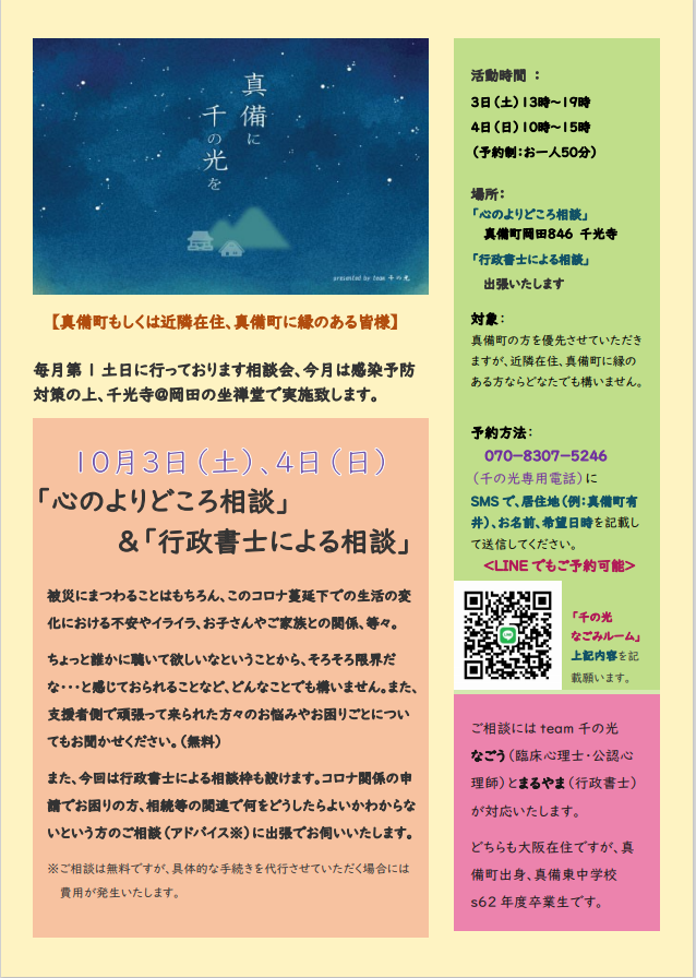 また、通常は「心のよりどころ相談」のみですが、今回は事務局Hも加わり、相談活動を拡大して行う予定です。