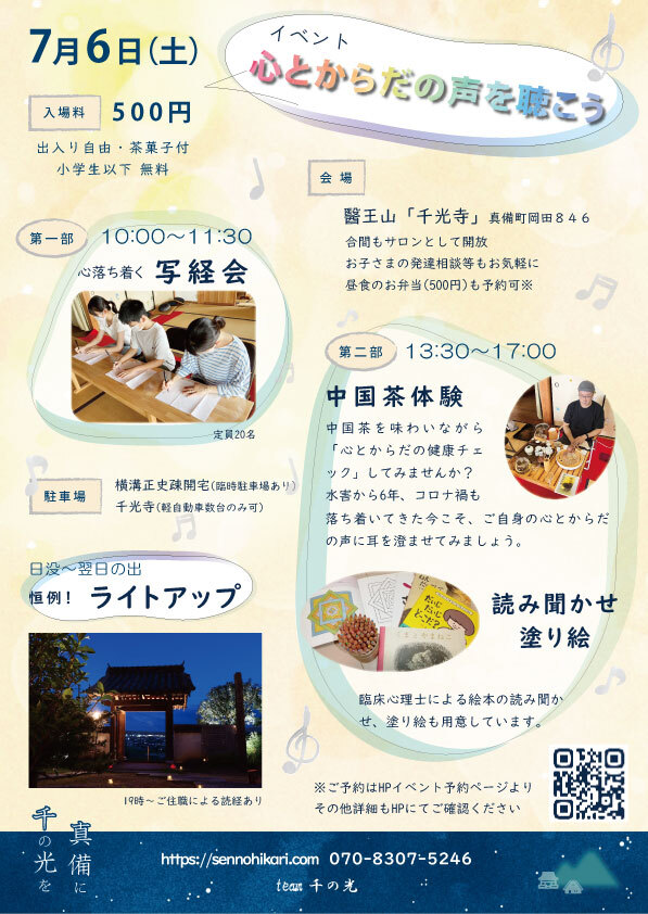 7月6日(土)、西日本豪雨から丸6年を迎えるこの日、ささやかなイベントと例年通りのライトアップを真備町岡田千光寺で行いました。今年は遅い梅雨入りで、心配した雨こそ降りませんでしたが、暑い暑い一日となりました💦