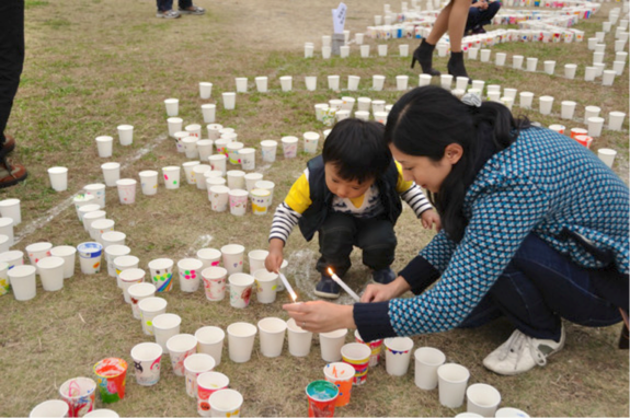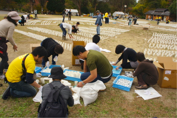 2012年に初めて実施をした際には、陽が暮れ暗闇となった千里南公園の道なりに、約800 名のボランティアによって灯りが灯された9万個のキャンドルが並びました。この個数は、千里ニュータウンの人口と同じ数です。人口と同じ数を設定しているのには、キャンドル一つ一つを住民一人一人に例え、その輝きを自分たちで灯そう、という思いが込められています。また、当日飾るキャンドルカップには、子どもたちからお年寄りまで住民一人一人のメッセージが寄せられ、重し用の土が入れられた上に、一つ一つ丁寧にキャンドルが灯されて完成します。
