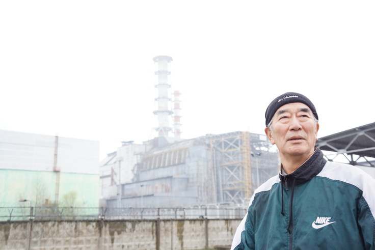 ウクライナ・チェルノブイリ原発事故現場前に立つ中村敦夫さん。