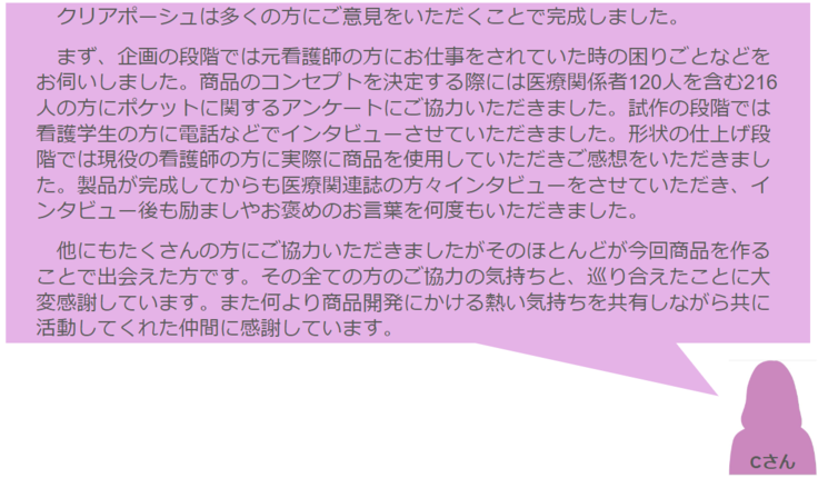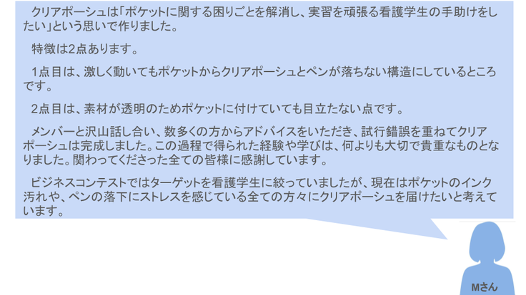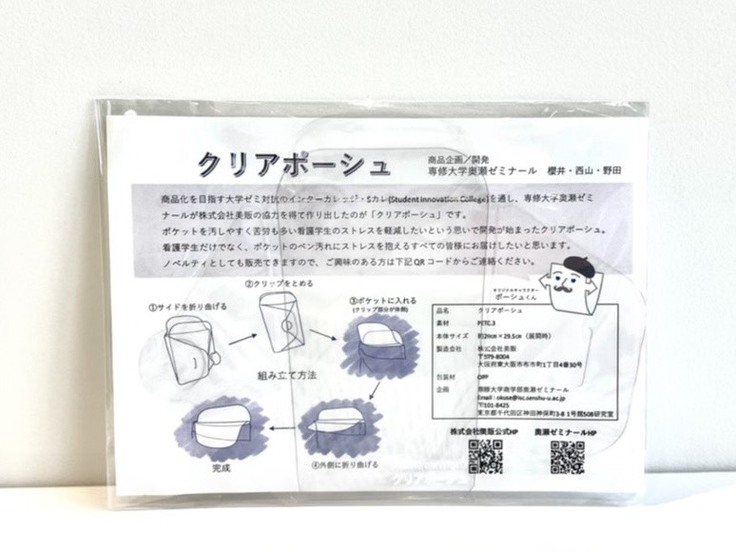 2020年のSカレテーマの1つであった株式会社美販のクリアシート「小物A4サイズのPET・PPシートを使った、購入した人がそのまま、もしくは組み立てて使用できる、もらってウレシいクリアシートの小物の提案」の中で、多忙な看護学生の力になりたいという思いからクリアポーシュは生まれました。