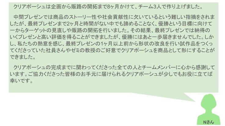 私たちは、4年生の思いもぜひ知ってクリアポーシュを手に取って欲しいと考えています。