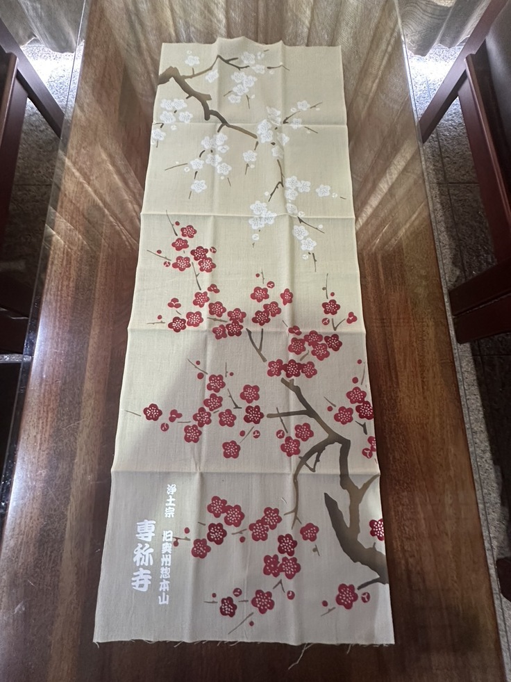 今回の返礼を相談したところ、既製品の中から梅をあしらったてぬぐいに当山の名前を入れていただきました。