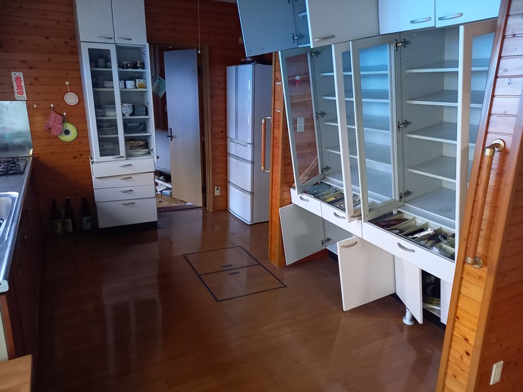 倒れかかっている食器棚はどうしようもないので、残った食器類は、奥の棚に整理。