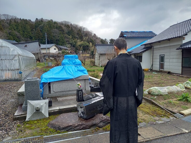 倒壊した墓を移設するため、門徒さんの墓で読経させていただきました。