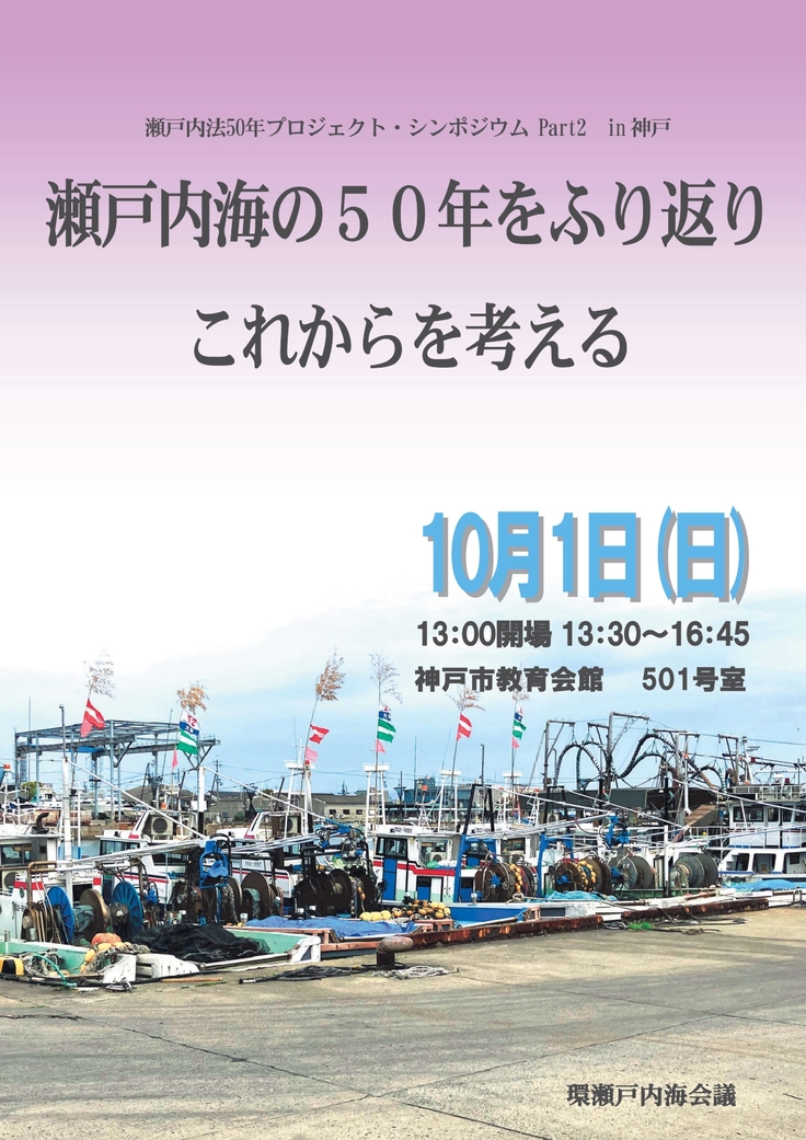 1973年10月2日に「瀬戸内海環境保全臨時措置法」(現在は「特別措置法」、通称「瀬戸内法」)が制定されて50年、瀬戸内海をめぐる状況はどのように変化し、どのような施策や対策がとられてきたのか、漁協への聞き取り調査や自治体の調査をふまえて、未来への展望を語り合うというのがこのシンポジウムの目的でした。