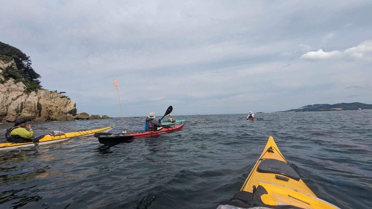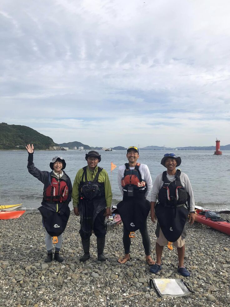 横断隊2日目。隊士のカヤック4艇が岡崎海岸を8:13に離陸し、海へ漕ぎ出しました!