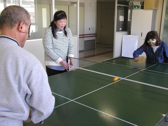 鉛の入った球をラバーのないラケットで打ち合います。見える人はアイマスクをするので、ハンディな