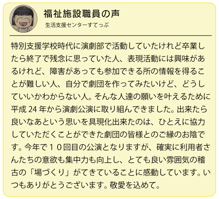 これを機に、演劇を観たことがなかった方も、障害者に関わりがなかった方も、そしてこの活動に賛同してくださる方も、皆様是非お越しください。