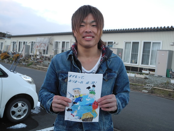 僕たちの彼との出会いは、2013年8月16日。たまたま浅野さんがあずまーれという仮説住宅のカフェに来ていて、なかなかかっこええイケメンやなと思ったのが最初です。そこでいろいろなお話をしているうちに、地元の若者として、彼も南三陸という愛する故郷のために何かしたいということを知り、自分達のパンフレット作りに協力を依頼しました。この「まずもって、あづま~れ」というタイトルは、カフェあづま~れに由来しています。このプロジェクトのトップ画像にもなっている表紙の絵。浅野さんはこんな思いをこめて書いてくれました。