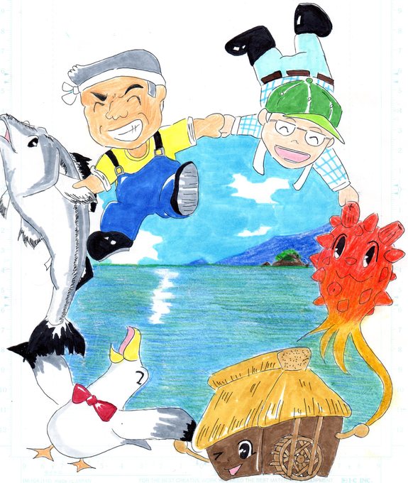 今回は、表紙の絵について紹介します。この表紙は、南三陸の地元の若者、浅野健仁(あさのたけひと)さんが書いてくれました。絵を描くことが好きで、幼いころから自分の趣味で描いているそうです。