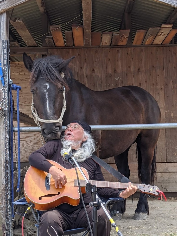 今回は天候不順が予想されるのとWi-Fi環境が馬小屋に整っていない為、有住さんのご自宅である風庵(しなどあん)からお届けします。(今回の配信では馬は登場しませんが、馬とのくらしを歌った楽曲をお楽しみ下さいね!)