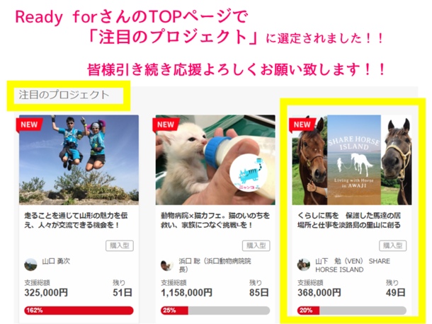 そして、それを受けてReadyforさんのTOPページで「注目のプロジェクト」にピックアップ頂けました!
