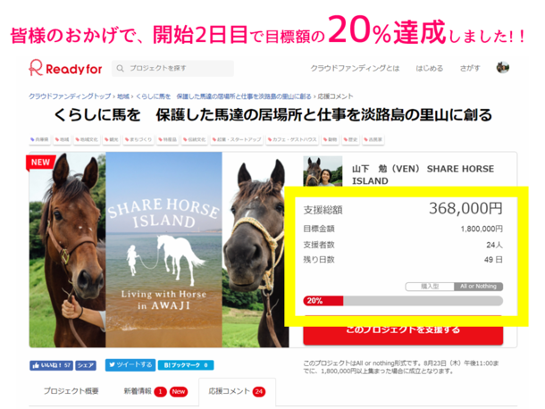 皆様のおかげで、なんと2日目で目標金額の20%達成という幸先の良いスタートが切れました!