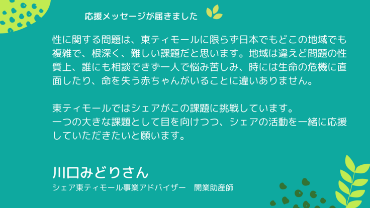 ✨🌏シェア東ティモール事業アドバイザー 開業助産師 川口みどりさんより応援メッセージをいただきました📢📢📢