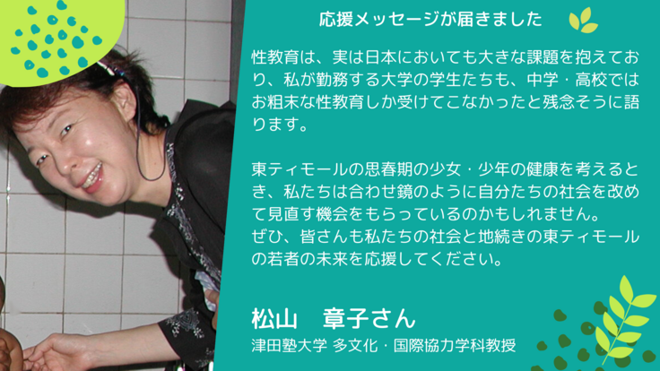 東ティモールの思春期の少女・少年の健康を考えるとき、私たちは合わせ鏡のように自分たちの社会を改めて見直す機会をもらっているのかもしれません。