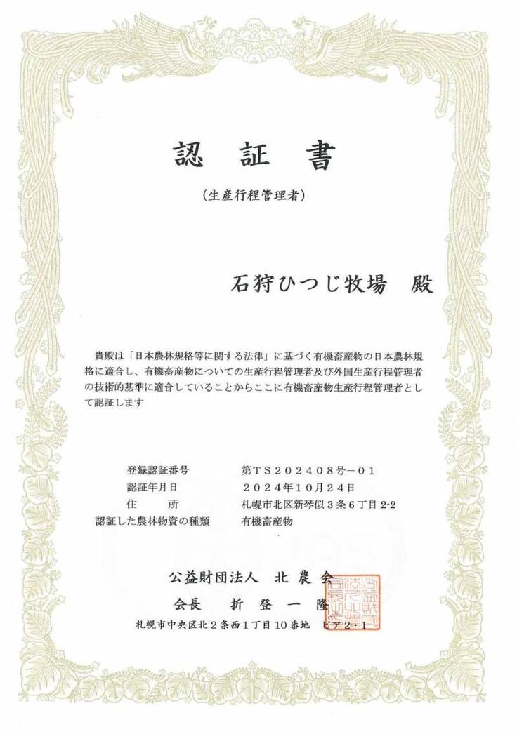 石狩ひつじ牧場の羊肉が、JAS有機畜産物として認証されました!