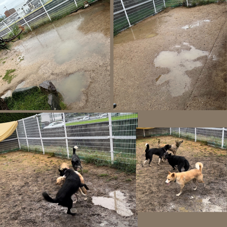 雨が降るとランには大きな水溜りができて池のような状態になってしまいます。