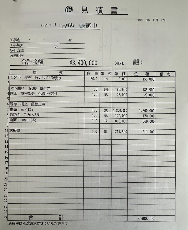 ランに雨除けの屋根を設置するのと、フェンス下を掘れないようにするための見積もりを何社かに依頼して、一番安くしてくださった会社様にお願いすることにしました。