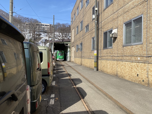 レールと枕木を車両に先駆けて運搬するために、電車事業所を訪問しました。