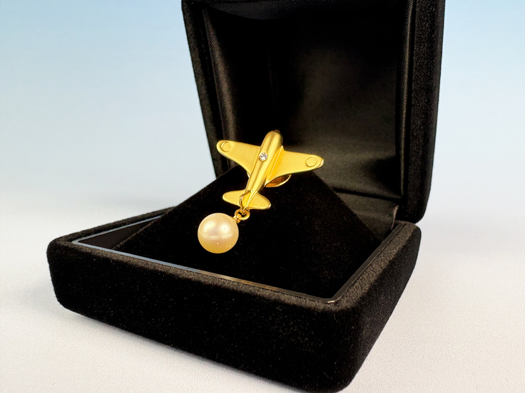 愛媛県宇和島市の井上真珠さんと共同開発された愛媛産真珠付き紫電改オリジナルピンズ。「機体のシルエット」に徹底的にこだわり、デザインされたとのこと。