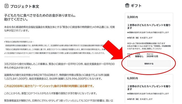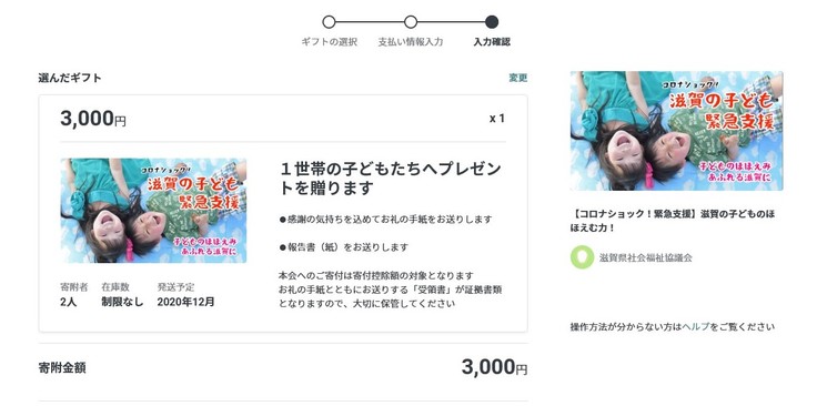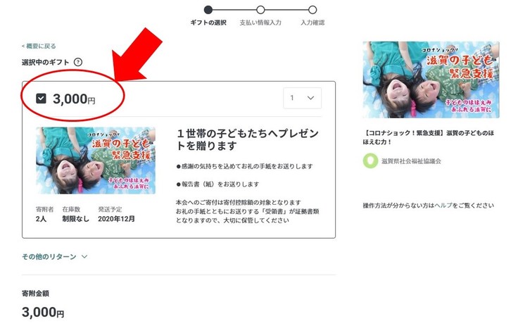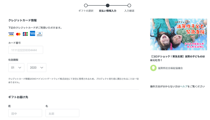 「ギフトのお届け先」にはプロジェクト成功後、滋賀県社会福祉協議会より、受領書や報告書をお送りする住所をご入力ください。