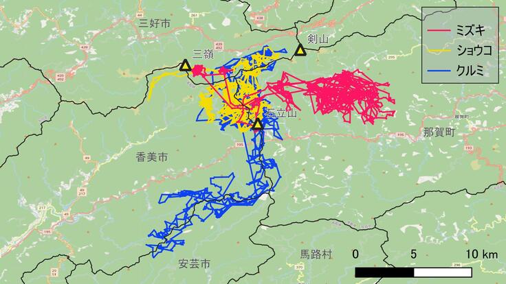 下記は、捕獲しGPS付きの追跡装置を装着して山に放したクマの、1年間の行動軌跡です。対象は、ミズキ、ショウコ、クルミと名付けた3頭です。