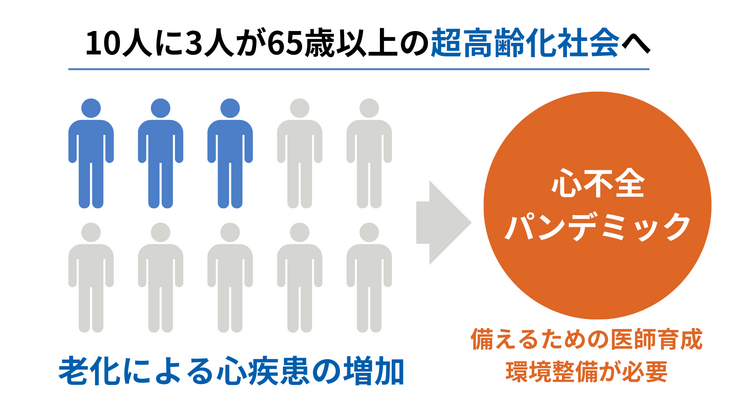 現在の日本は超高齢化社会を迎え、65歳以上の人口は2036年には33.3%に到達する*1とされています。それに伴い、老化による心疾患の増加は火を見るよりも明らかです。